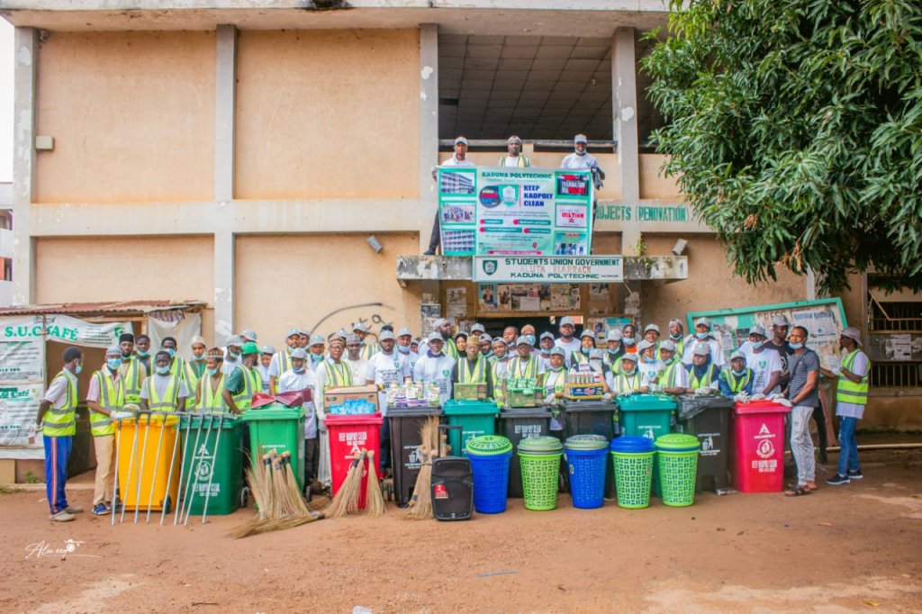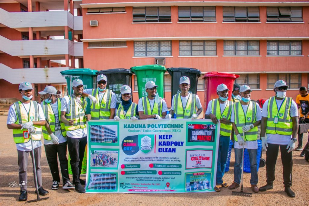 The students union government of Kaduna Polytechnic, led by Comr. Aliyu Muhammad Mangal, has made a generous donation of sanitation materials to commemorate World Cleaning Day. The materials, which include dustbins, brooms, Izal, Hypo, Dettol, Camphor, insecticides, fumigation items, rakes, packer, trash disposal bin and detergents, were handed over to Dr. Aliyu Hassan Ibrahim, the Managing Director of Kadpoly Consult. Present at the event were also Representative of Rector, Dean of Students Affairs, Malam Farouq Ndamadu Musa, Dean of various collages, Sanitation Committee representatives from collages and other dignitaries.